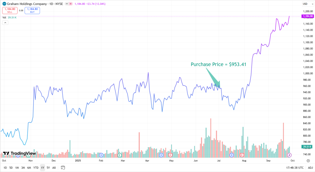 Our latest stock in the portfolio, Graham Holdings Corp (GHC) is now up 20% since its inclusion in the portfolio on July 2nd, 3 months ago.
